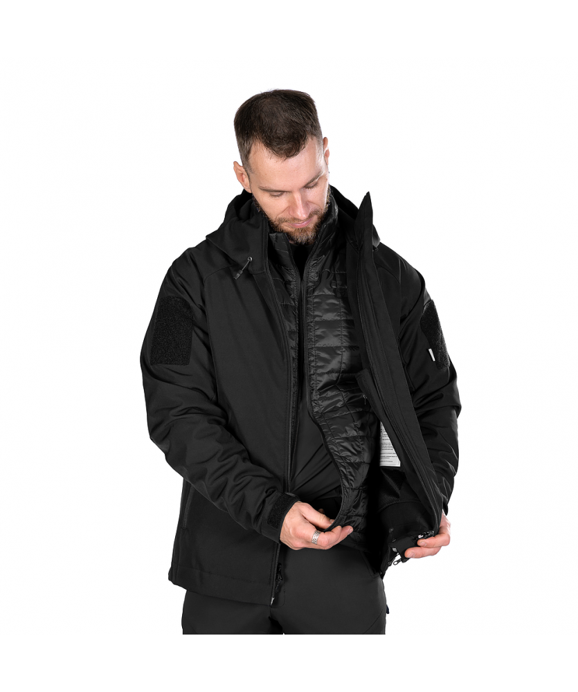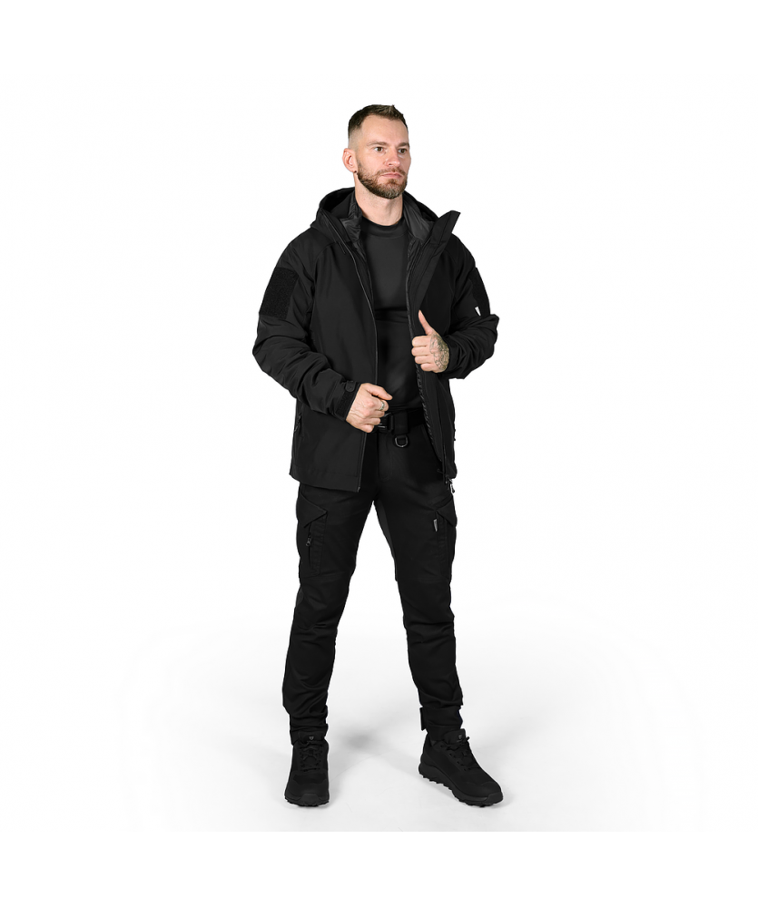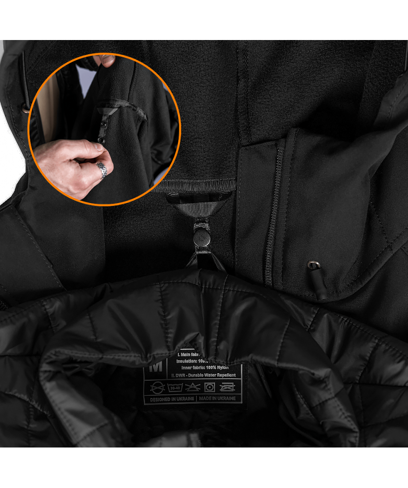 Куртка вироблена з оригінальної тканини SoftShell. Це легка, сучасна тканина зі справжньою безпоровою мембраною, яка складається з трьох шарів: мікрофліс який зберігає тепло; мембрана що захищає від вітру та вологи; еластичний поліестер із вологостійким просоченням, який захищає від пилу, бруду й вологи.