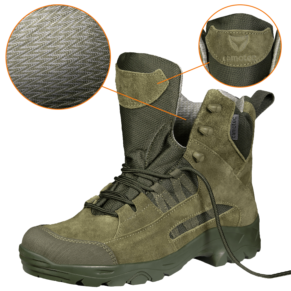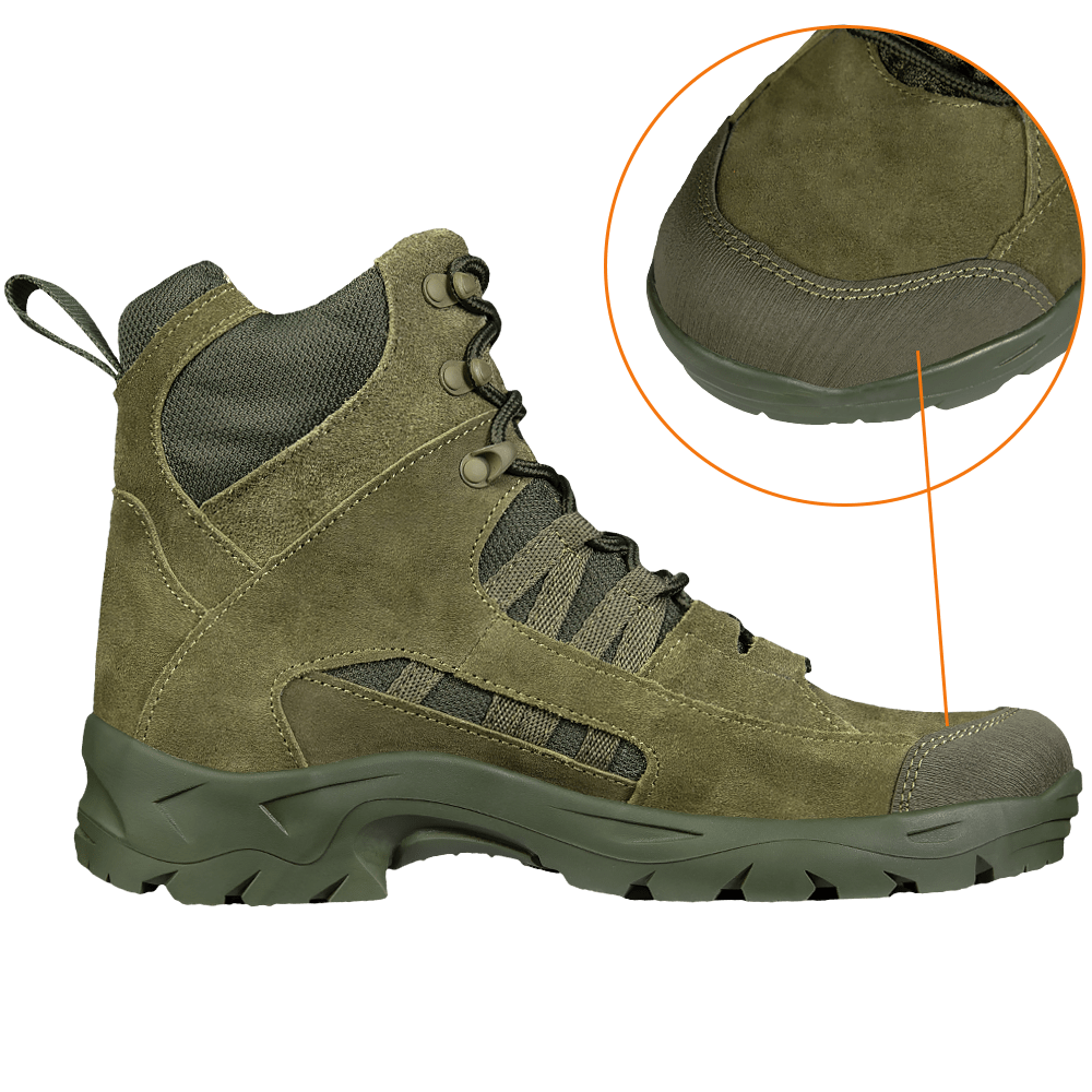 Черевики Oplot 2.0 від попередньої моделі відрізняються покращеними матеріалами преміумсегмента. А саме покращений нубук, який має більш щільну, ворсисту структуру що нагадує замшу. Такий же ворсистий і приємний на дотик, але при цьому має всі властивості нубуку. Щільний, зносостійкий матеріал з натуральної шкіри.