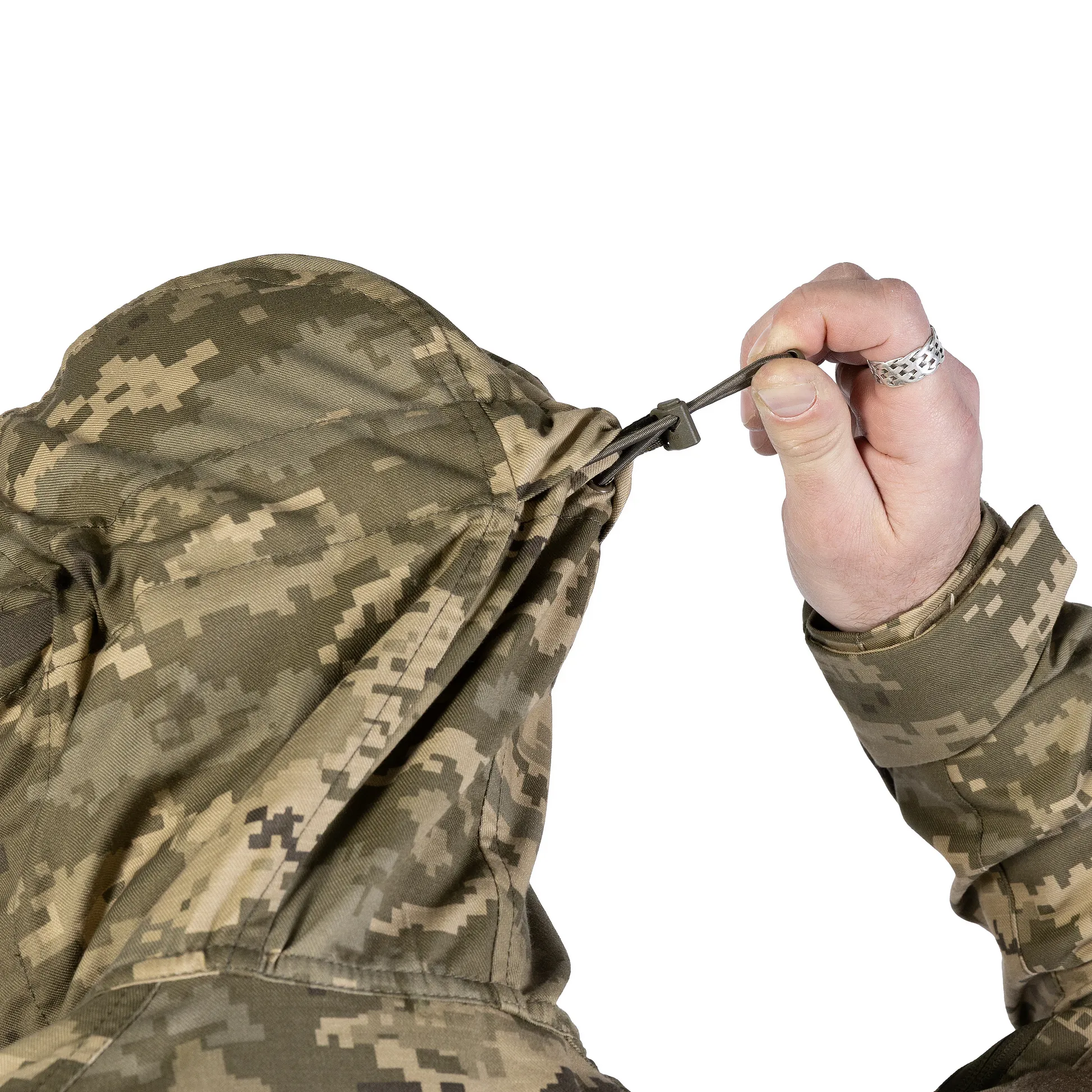 Куртка з каптуром має дві містких кишені спереду і дві кишені на рукавах, під липучками для патчів або шевронів.