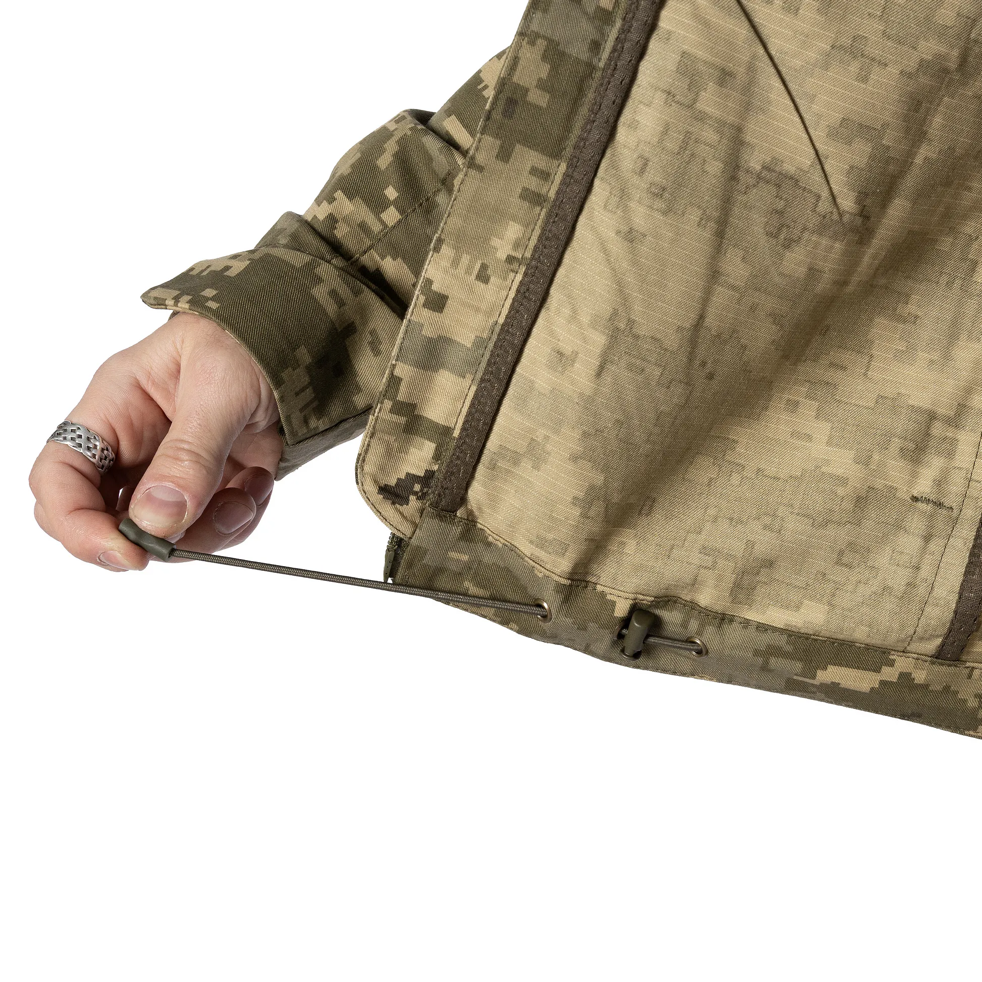 По низу куртки є спеціальні утяжки з пластиковими фіксаторами для регулювання фіксації.
