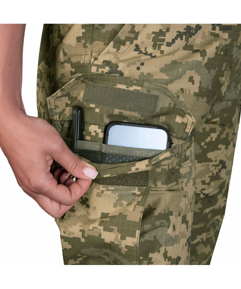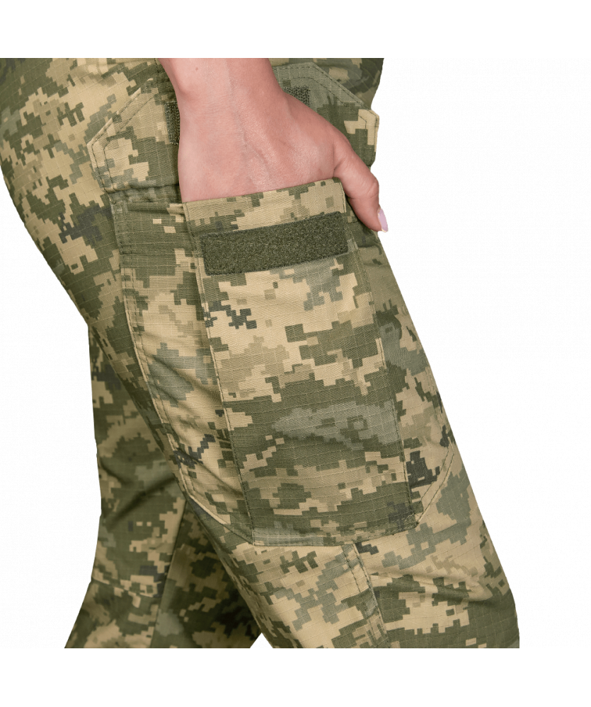 Модель штанів виготовлена з армованої, гіпоалергенної тканини Rip-Stop CVC. Це суміш поліестеру та бавовни, яка поєднує в собі міцність та гіпоалергенні властивості. Ця тканина має спеціальне плетіння, що запобігає поширенню розривів, утворенню дрібних отворів та допомагає зберігати її форму під час експлуатації.