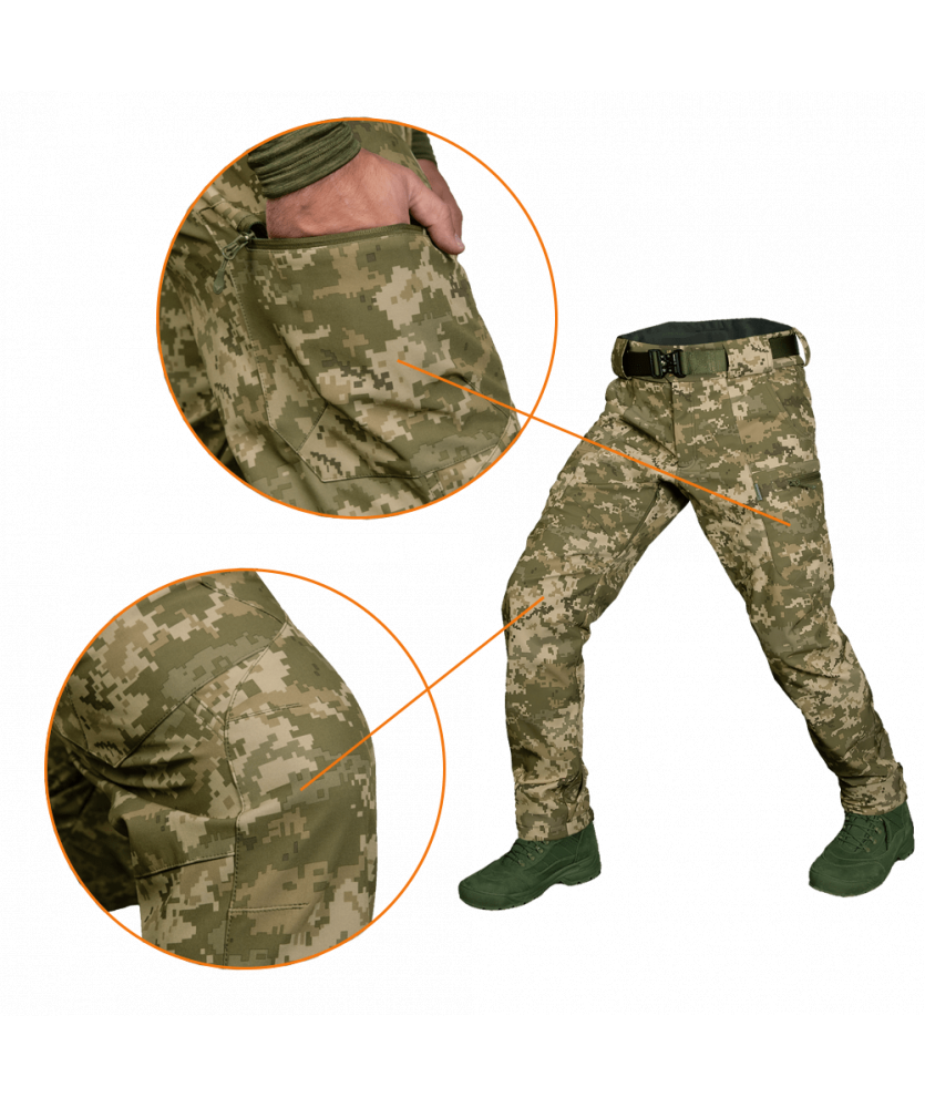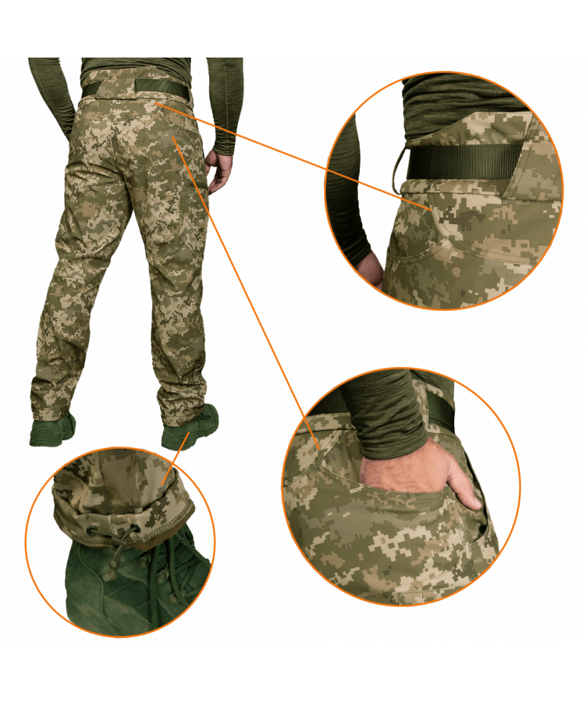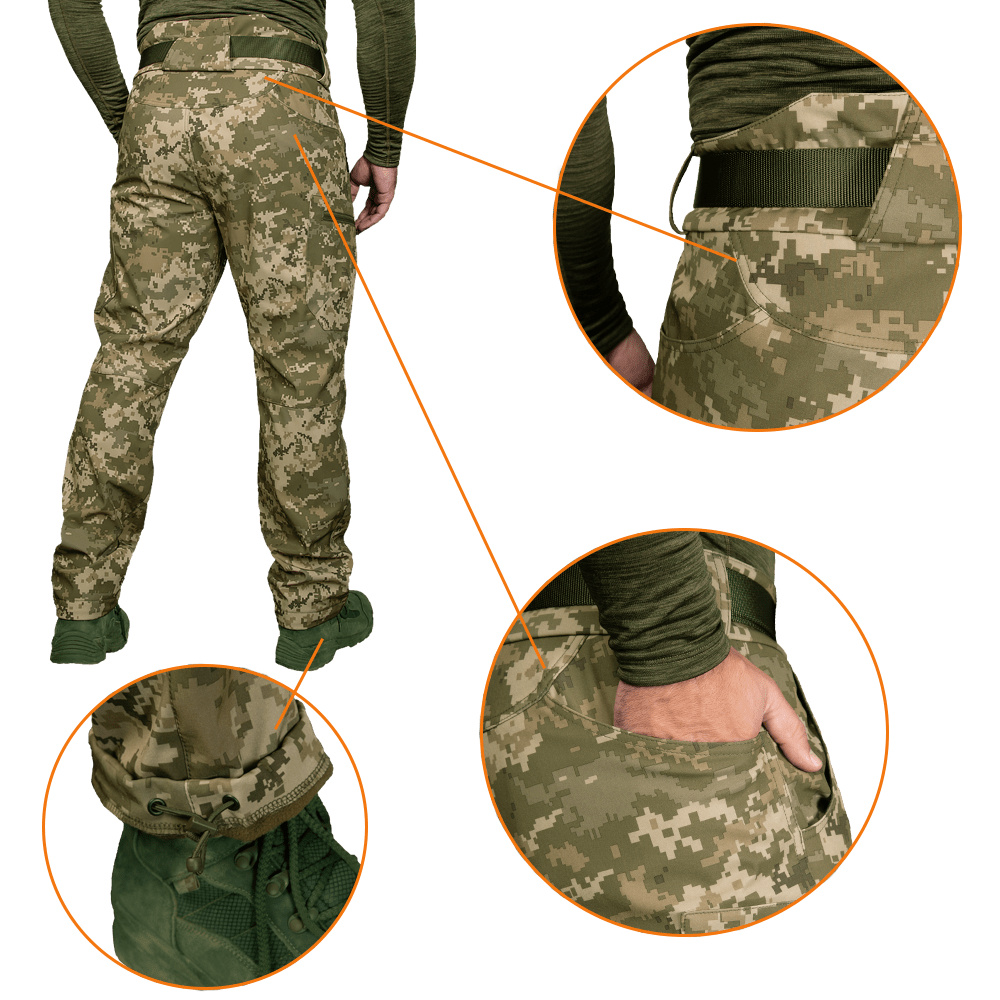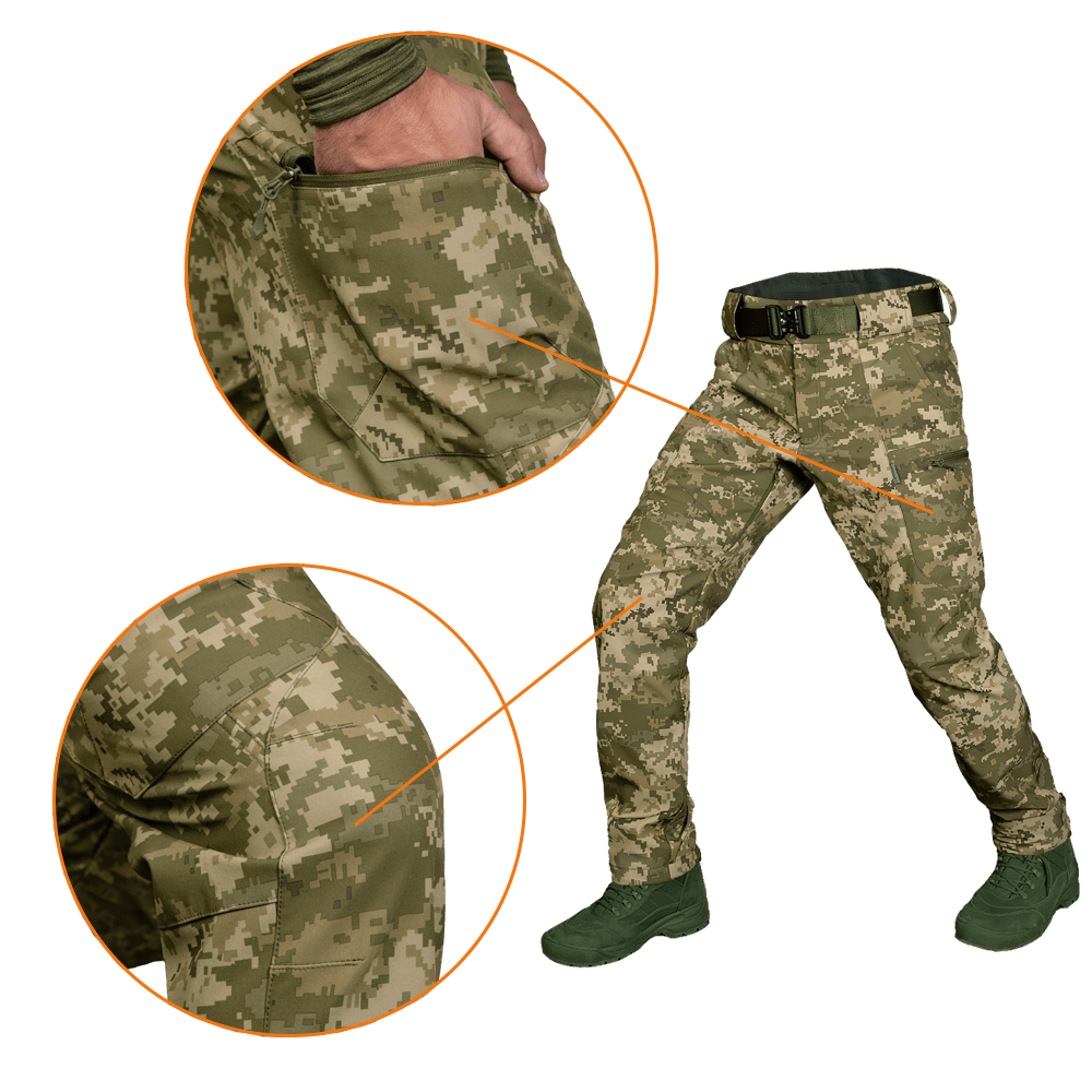 Штани мають ексклюзивний крій від компанії Camotec. Ергономічні виточки в зоні коліна та конструктивні вставки в промежині, що додає комфорту та запобігає натиранню при довготривалому використанні.