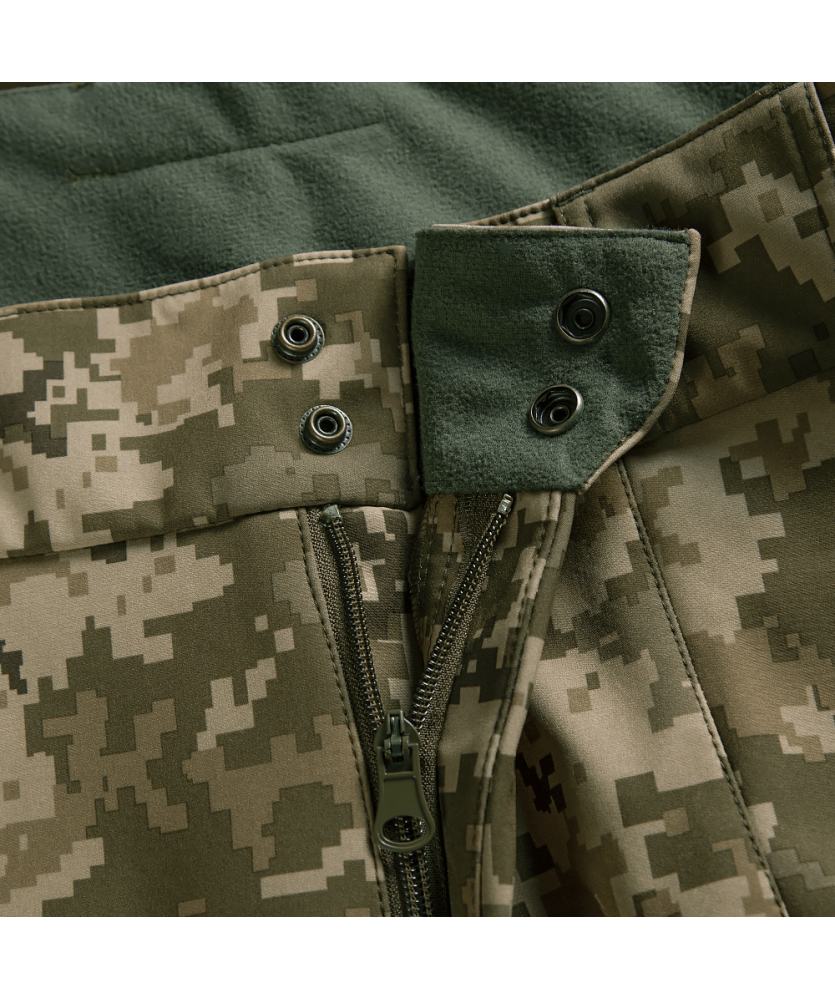 Штани вироблені з оригінальної тканини SoftShell. Це легка, сучасна тканина зі справжньою безпоровою мембраною, яка складається з трьох шарів: мікрофліс який зберігає тепло; мембрана що захищає від вітру та вологи; еластичний поліестер із вологостійким просоченням, який захищає від пилу, бруду й вологи.