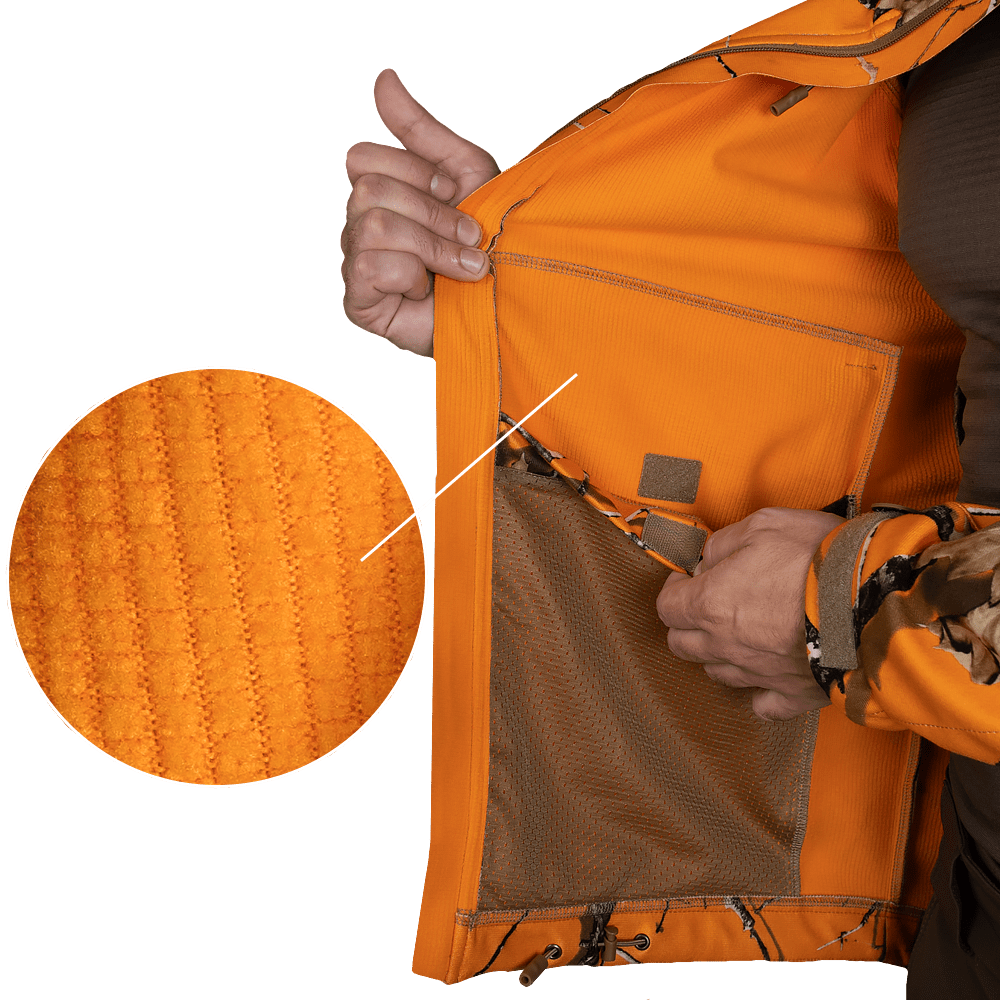 Сама тканина складається з декількох шарів: перший шар - зносостійкий і стійкий до пошкоджень поліестер; другий шар - мембранна, яка захищає від вологи та вітру; і третій шар - це Square Microfleecee. Спеціальний мікрофліс який згрупований у квадратики. Він ефективно зберігає тепло, не втрачаючи при цьому дихаючих властивостей тканини.