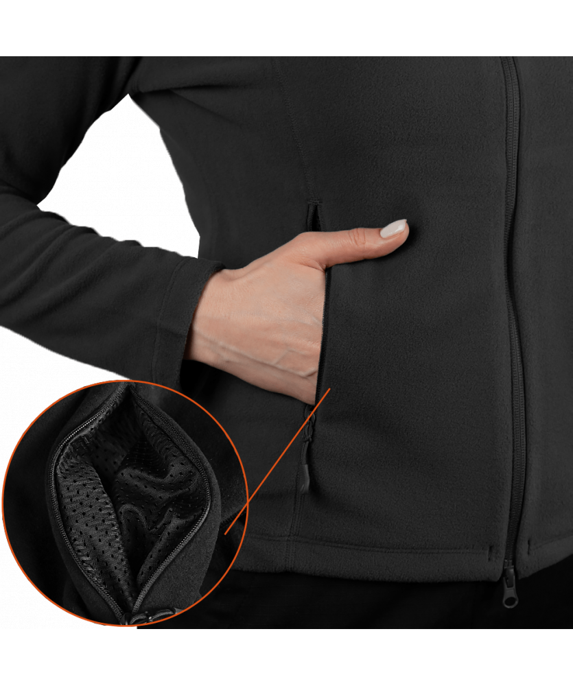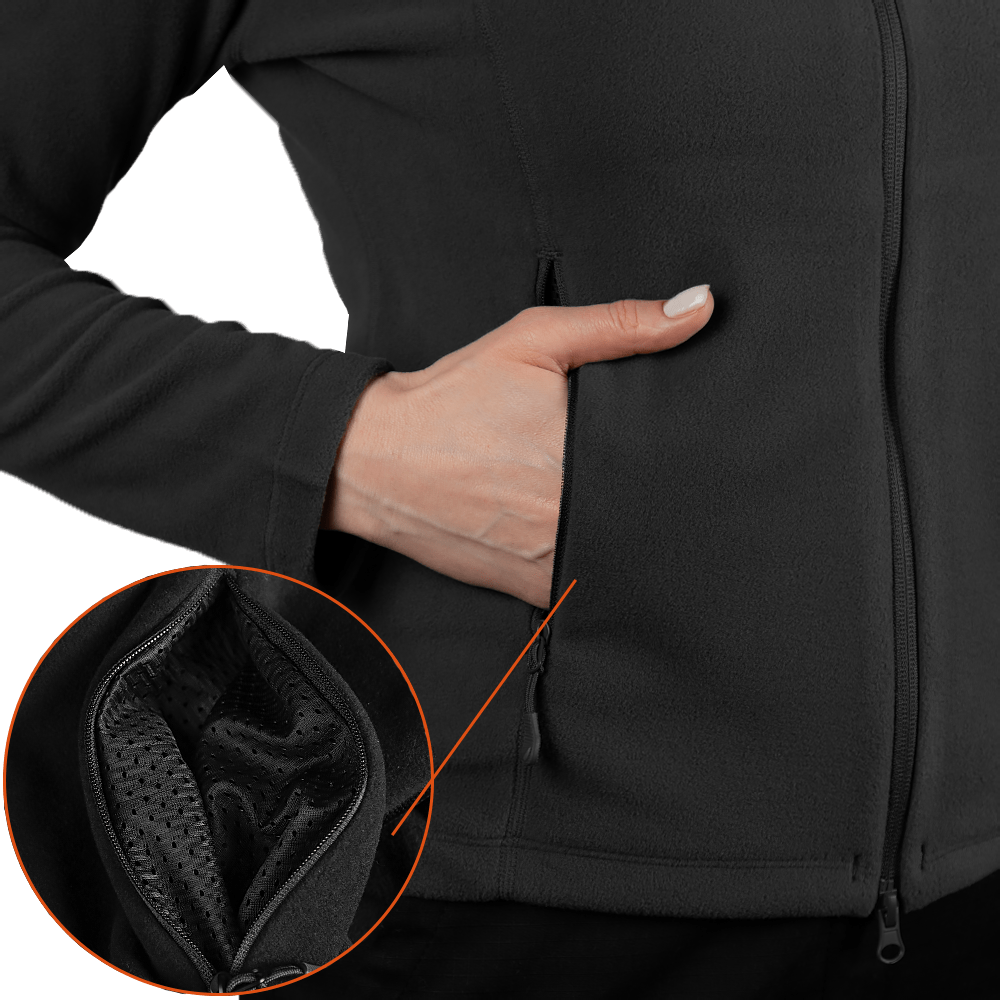 Кофта має дві кишені на застібках блискавках з вентиляційними сітками всередині. Центральна застібка має два ”бігунки для зручного регулювання. Усі застібки-блискавки оснащені пулерами для зручної роботи з ними в рукавичках