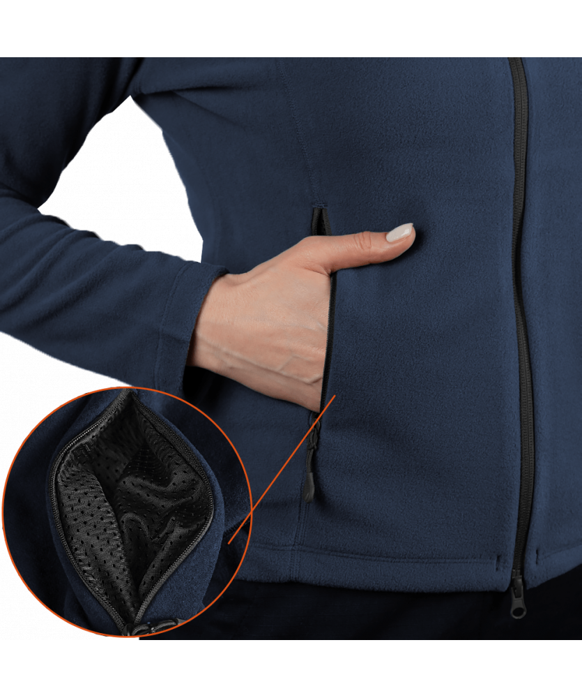 Кофта має дві кишені на застібках блискавках з вентиляційними сітками всередині. Центральна застібка має два ”бігунки для зручного регулювання. Усі застібки-блискавки оснащені пулерами для зручної роботи з ними в рукавичках