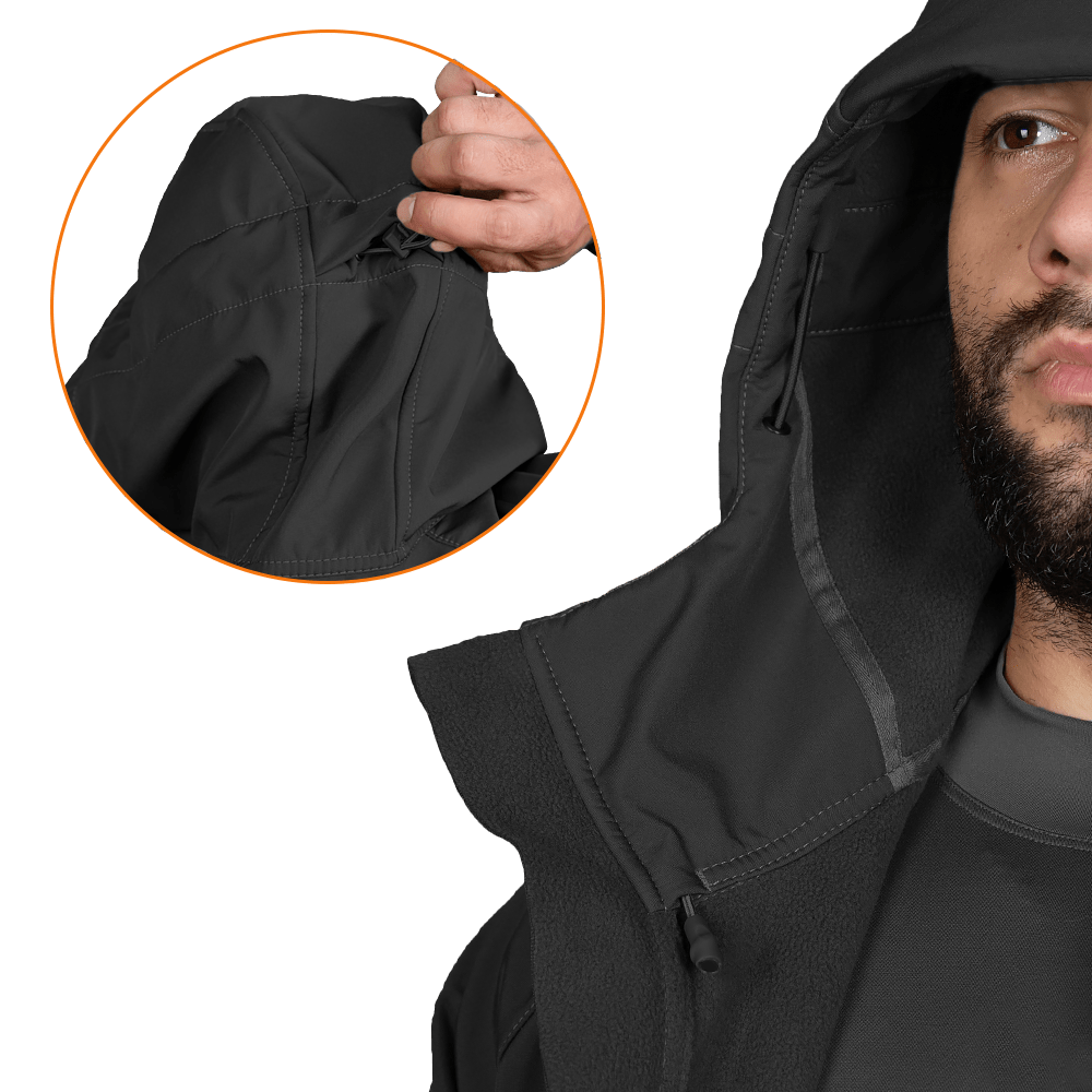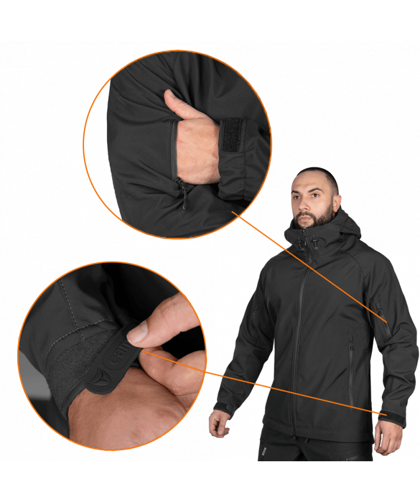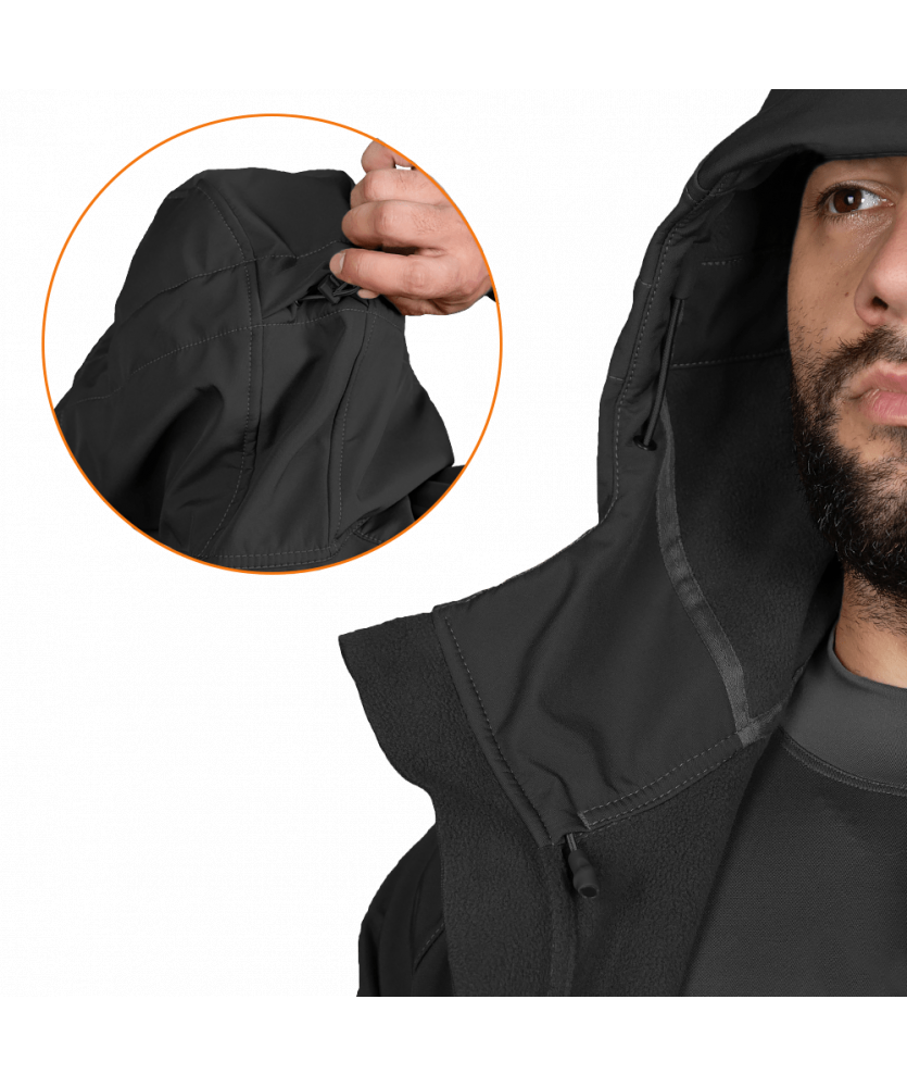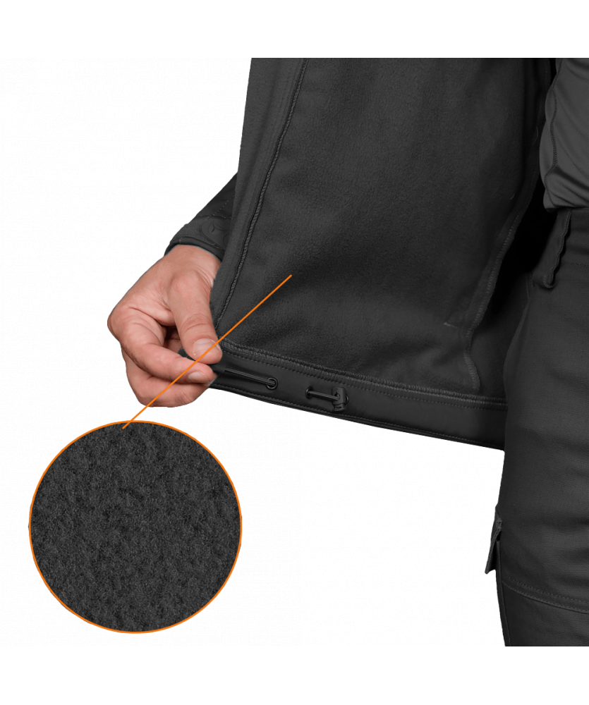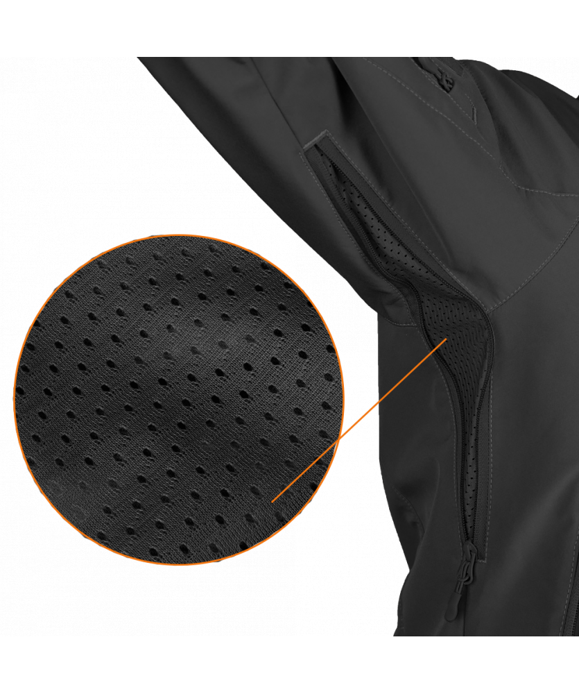 Куртка вироблена з оригінальної тканини SoftShell. Це легка, сучасна тканина зі справжньою безпоровою мембраною, яка складається з трьох шарів: мікрофліс який зберігає тепло; мембрана що захищає від вітру та вологи; еластичний поліестер із вологостійким просоченням, який захищає від пилу, бруду й вологи.