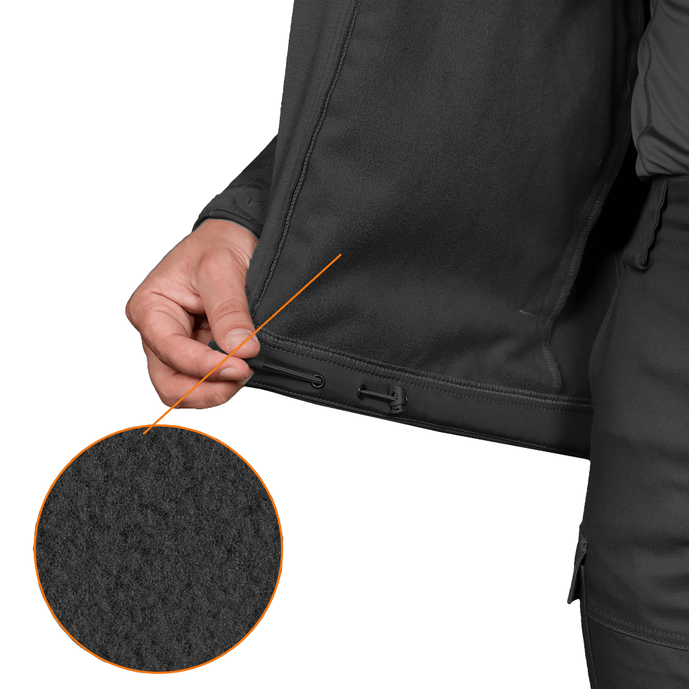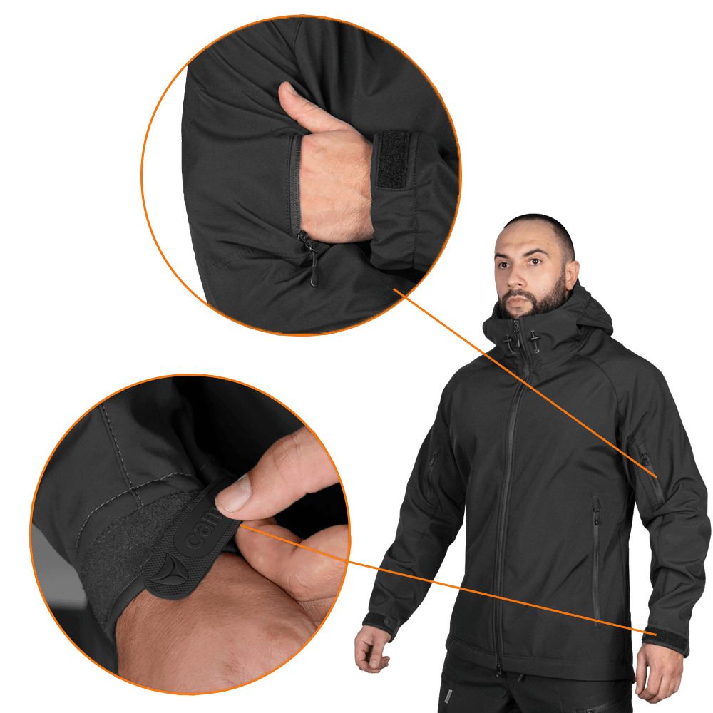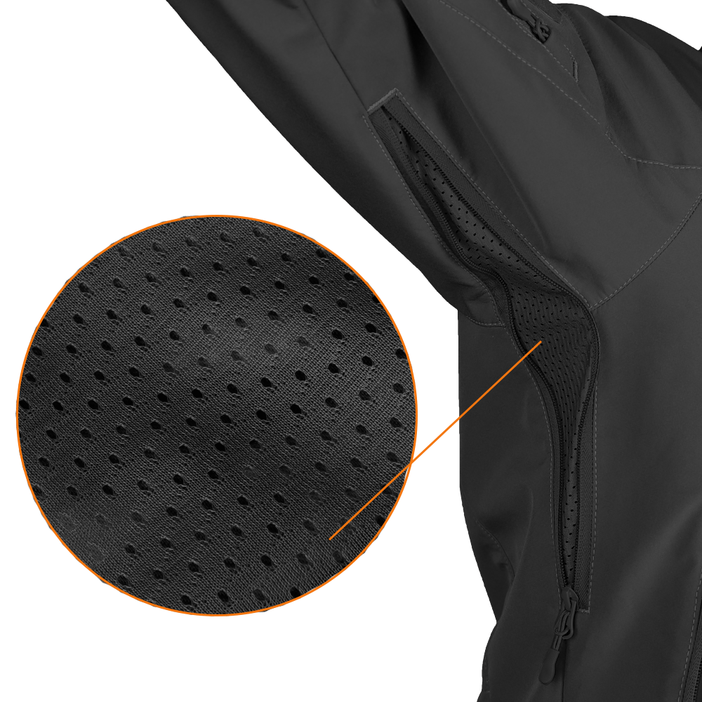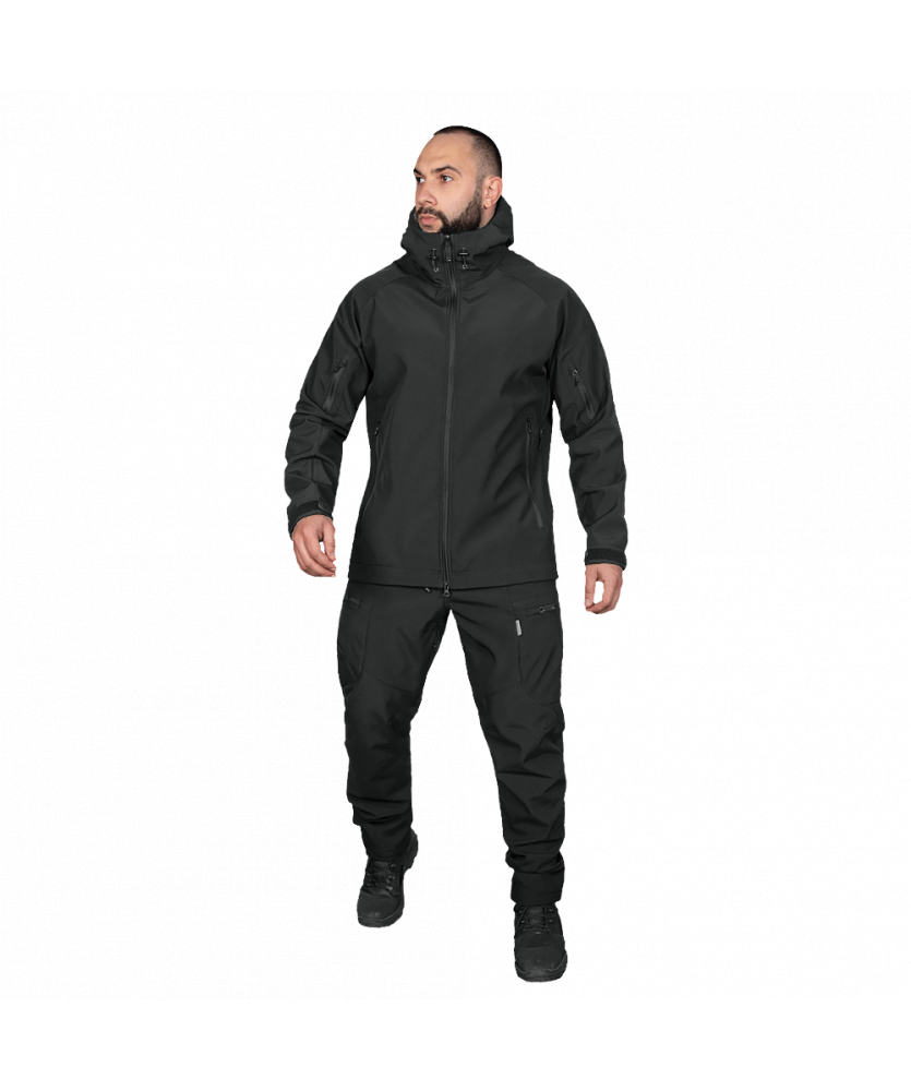 Куртка вироблена з оригінальної тканини SoftShell. Це легка, сучасна тканина зі справжньою безпоровою мембраною, яка складається з трьох шарів: мікрофліс який зберігає тепло; мембрана що захищає від вітру та вологи; еластичний поліестер із вологостійким просоченням, який захищає від пилу, бруду й вологи.