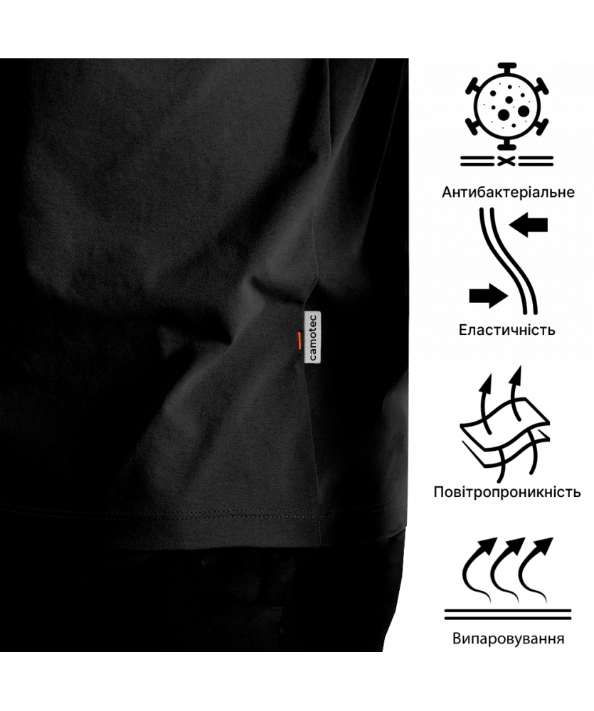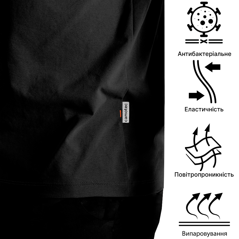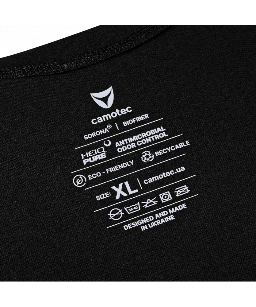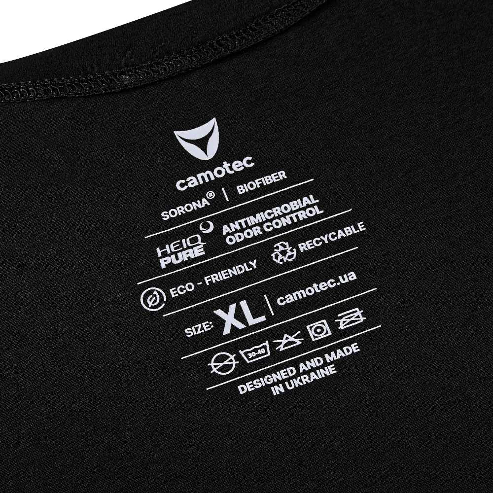 Футболка вироблена з тканини Sorona® - це новий стандарт інновацій серед технологічних тканин. Основа тканини - активні целюлозні волокна рослинного походження, тобто виготовлені з природних матеріалів. Вони мають природну структуру, що ефективно керує швидким транспортуванням вологи від тіла, це зберігає ваше тіло приємно прохолодним та сухим при фізичній активності.