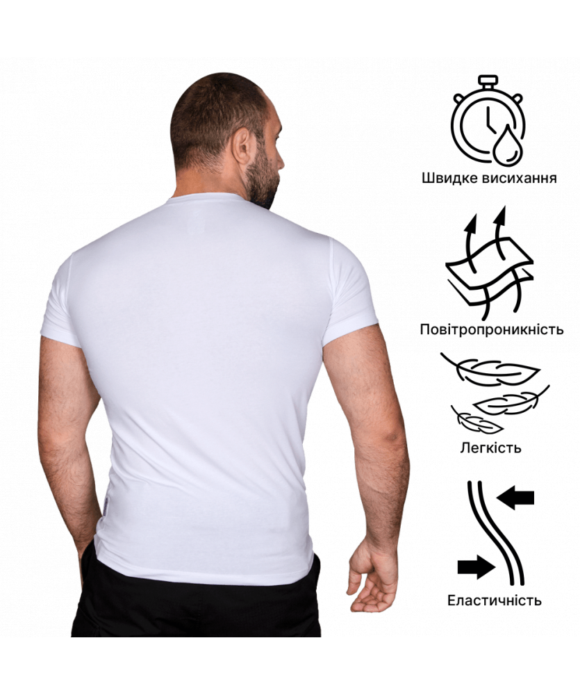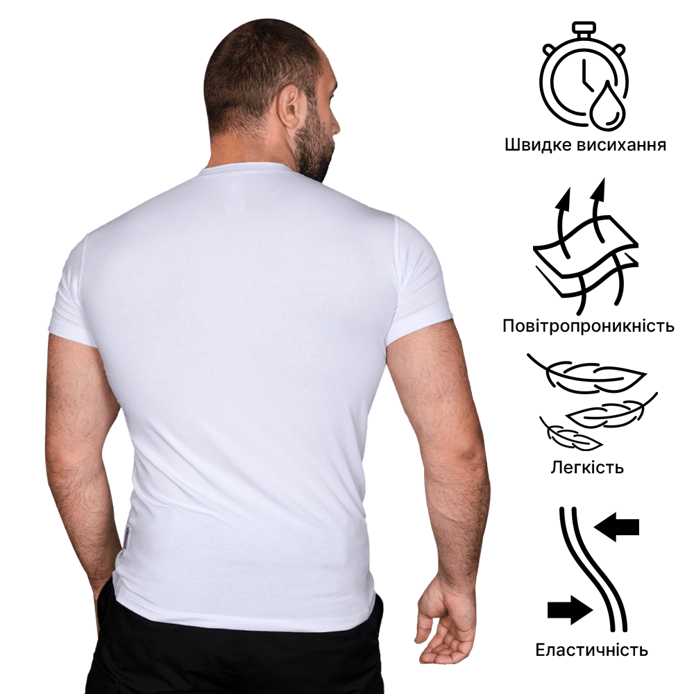 Футболка зшита надійною, еластичною ниткою, за технологією плоских швів. Має зручний, сучасний дизайн та щільно прилягає до тіла, не сковуючи при цьому рухів та не викликає подразнень при тривалій експлуатації.