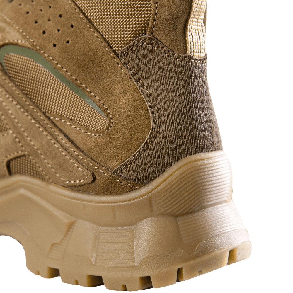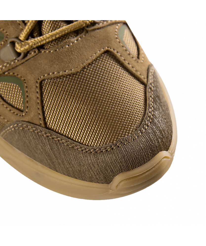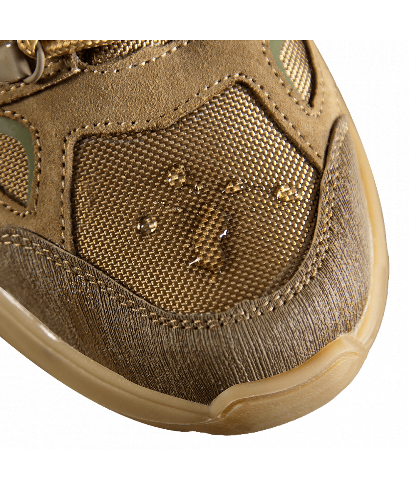 Носок та задня частина стопи посилені шкірою з захисним покриттям і армованим термопластом, що забезпечує додаткову стійкість до ударів і зношування.