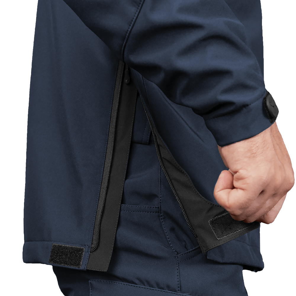 Однією з особливостей нашої куртки є спеціальні вирізи по боках - для Вашого швидкого доступу до зони поясу. Зазвичай на поясі кріпиться кобура зі зброєю або пояс із додатковим спорядженням, а ці вирізи надають Вам швидкий доступ до цієї зони (відкриття займає кілька секунд одним рухом). Самі вирізи застібаються застібкою-блискавкою і фіксуються липучкою.