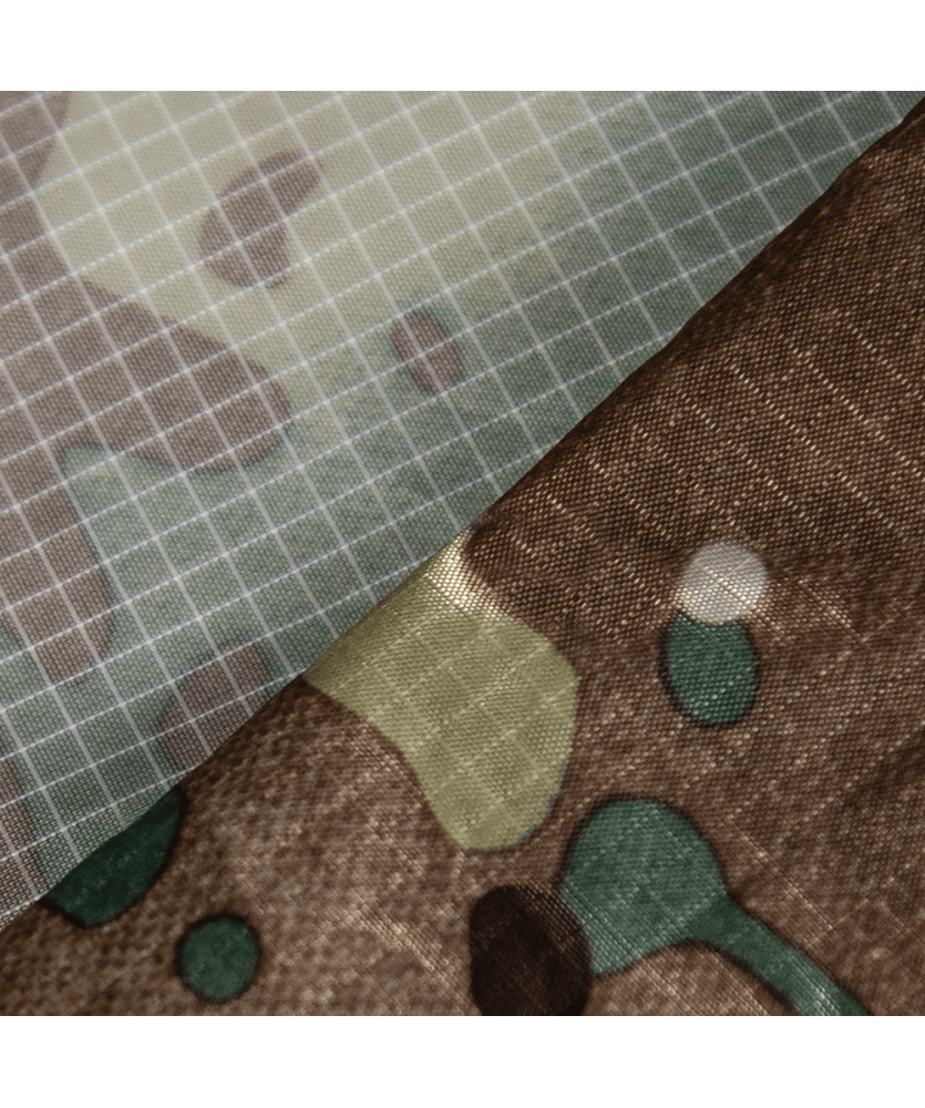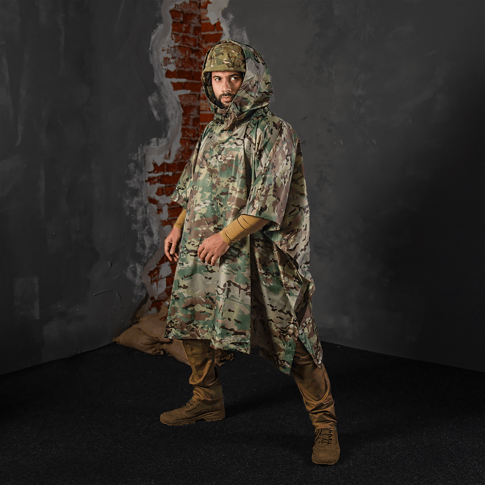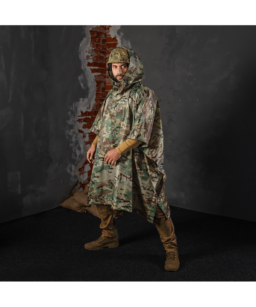 Пончо вироблено з тканини Micro Rip-Stop. Матеріал дуже міцний та стійкий до стирання й розривів. Гарні властивості тканин Micro Rip-Stop обумовлені їх структурою: в матеріал вплетені армовані нитки, що утворюють каркас, і у разі механічного пошкодження тканини, запобігає збільшенню області пошкодження.