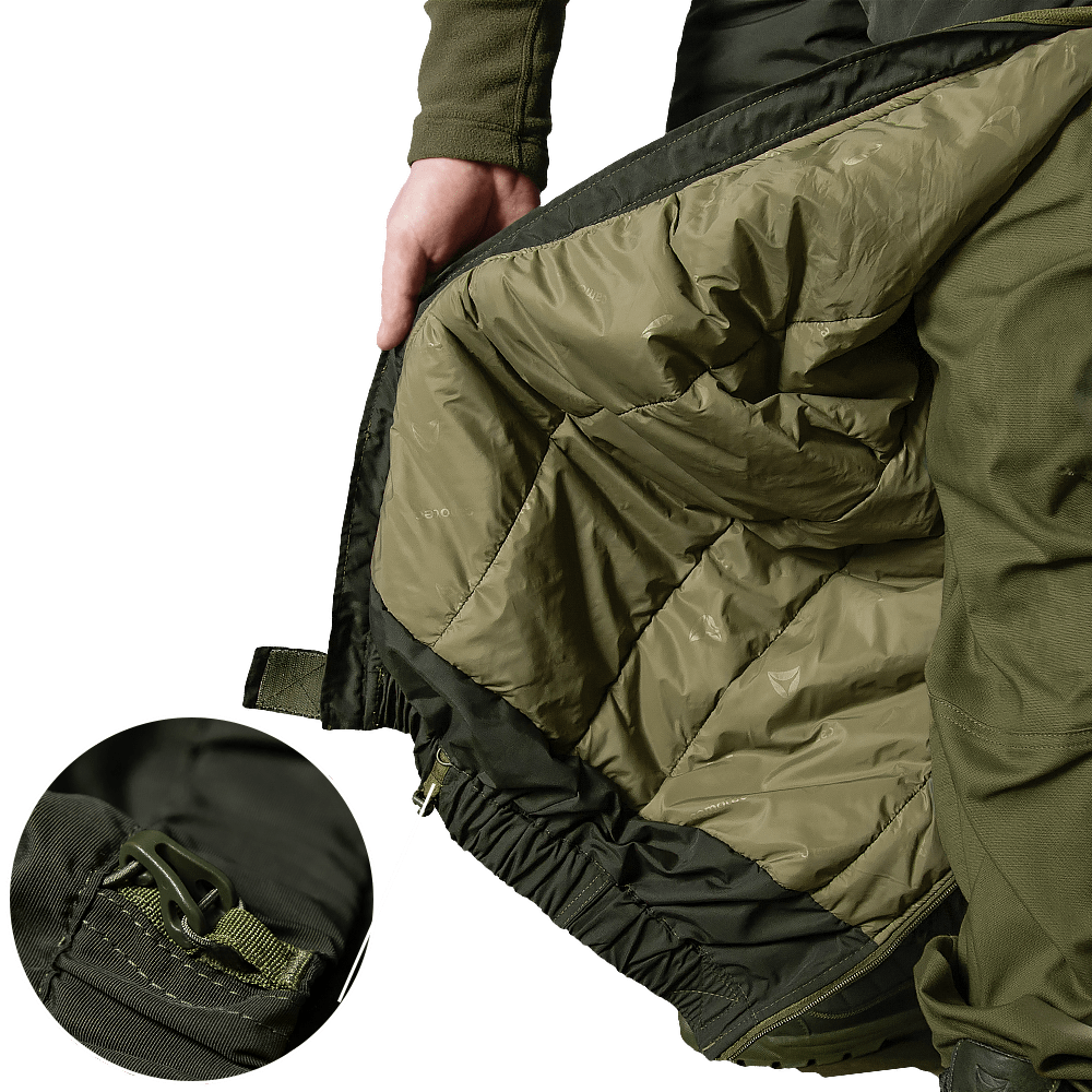 Якісне зберігання тепла надає TEMPLOFT. Це — інноваційний український утеплювач, розроблений під час війни з росією. Ефективну терморегуляцію забезпечують внутрішні камери, які захоплюють тепле повітря. Матеріал легкий, являє собою аналог натуральному пуху. Завдяки своїй структурі, TEMPLOFT не лізе через тканину, не намокає, а також має високу пружність. Всередині штани мають простьобаний підклад з приємного на дотик нейлону, що запобігає збиванню утеплювача.