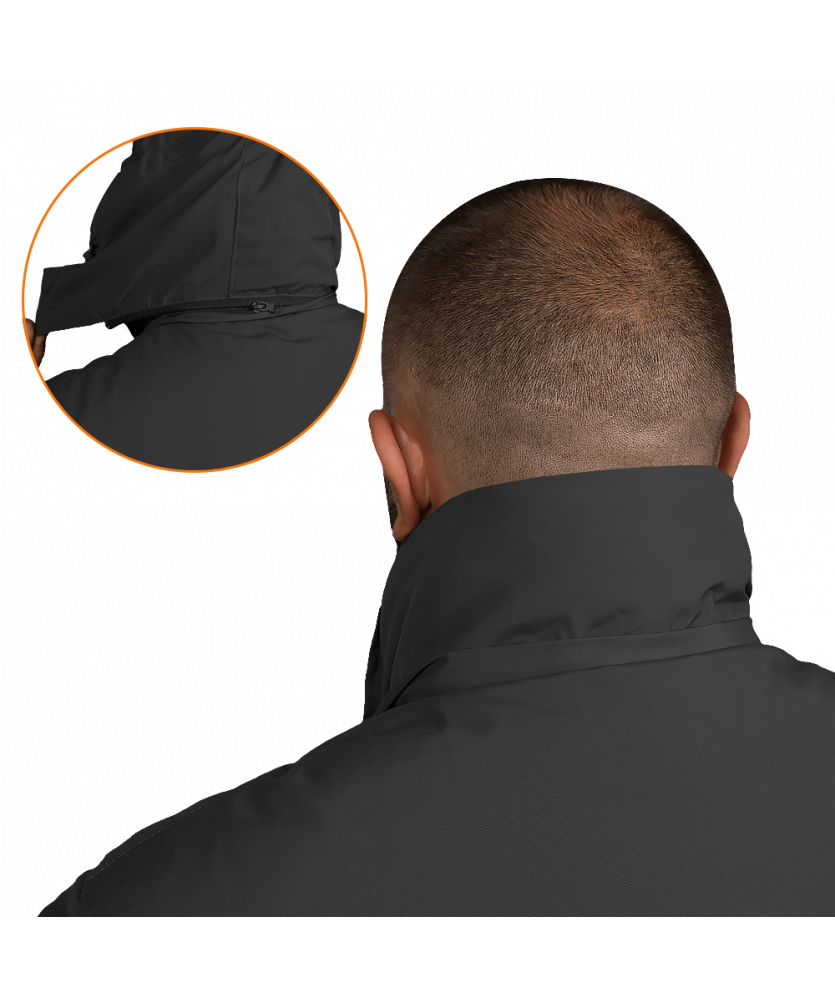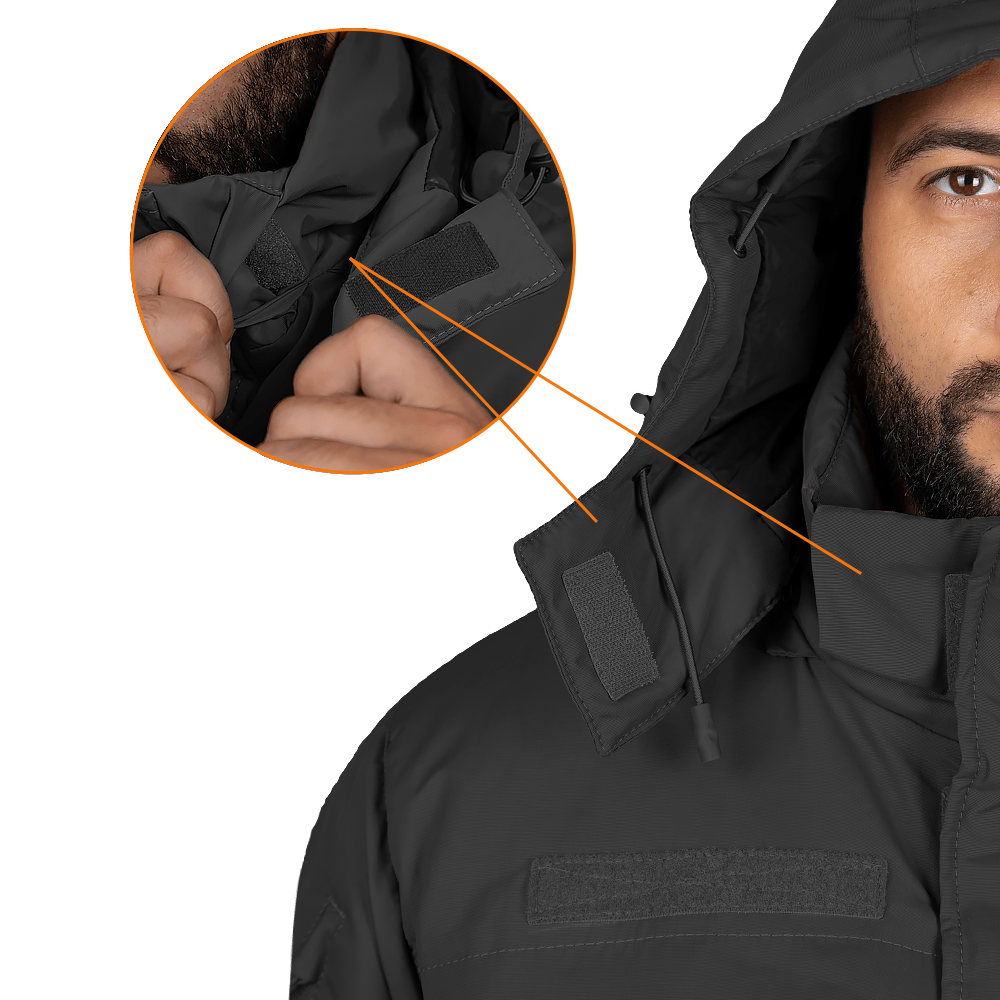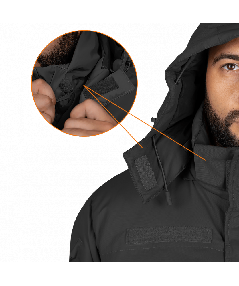 Куртка оснащена утепленим каптуром, що знімається. Він фіксується на блискавку і застібається на липучки, які можна сховати у спеціальних відділеннях в комірі. Зручний ергономічний дизайн дозволяє регулювати глибину, об’єм та ширину каптура, а піддашок надає додатковий захист під час снігу та дощу.