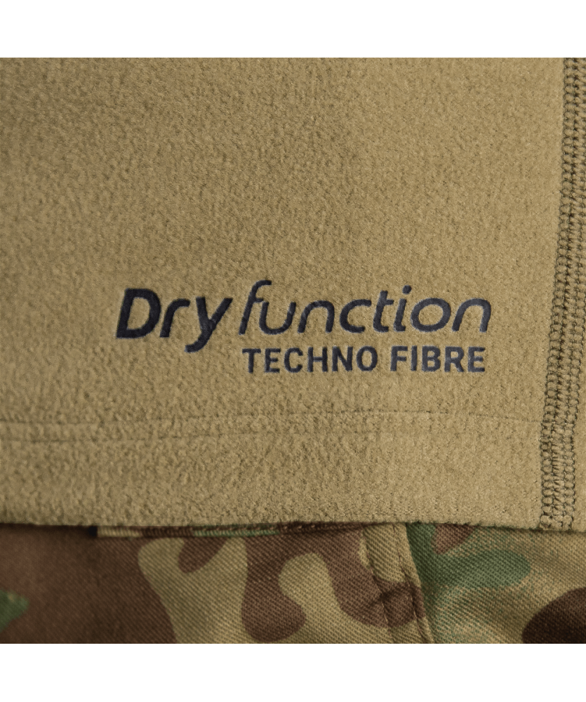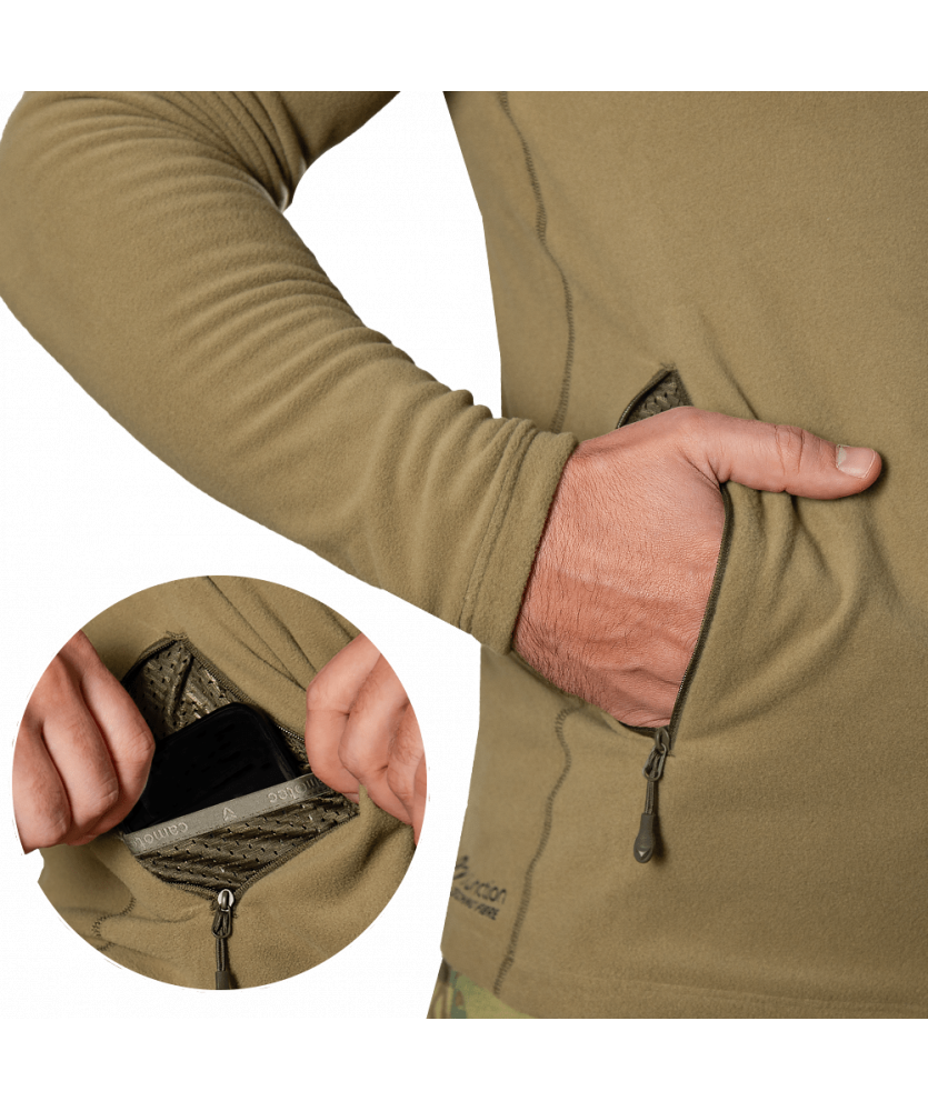 Кофта виготовлена з функціональної флісової тканини Himatec Air Basic (100 series) — легкої, пухкої та приємної на дотик. Завдяки структурі тканини утворюються повітряні прошарки, які ефективно утримують тепло, забезпечуючи високі термоізоляційні властивості при малій вазі. Матеріал добре дихає, відводить вологу, швидко сохне та має антибактеріальне просочення, яке запобігає утворенню та розповсюдженню бактерій. Еластичність тканини гарантує повну свободу рухів.