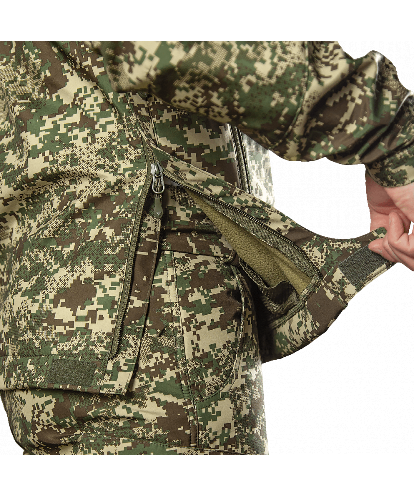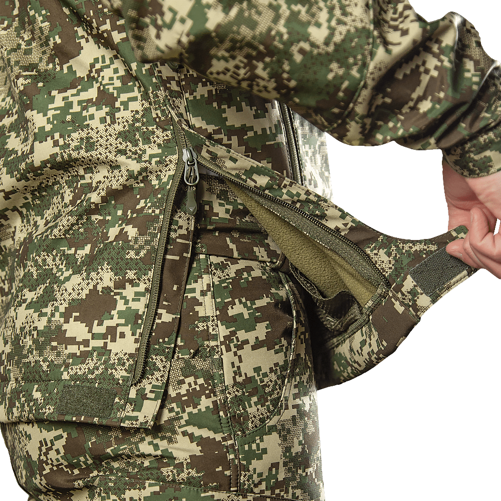 Однією з особливостей нашої куртки є спеціальні вирізи по боках - для Вашого швидкого доступу до зони поясу. Зазвичай на поясі кріпиться кобура зі зброєю або пояс із додатковим спорядженням, а ці вирізи надають Вам швидкий доступ до цієї зони (відкриття займає кілька секунд одним рухом). Самі вирізи застібаються застібкою-блискавкою і фіксуються липучкою.