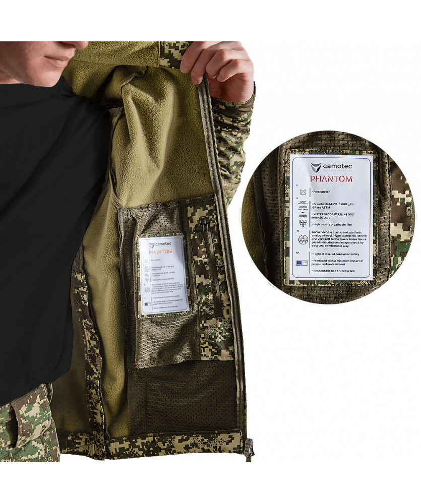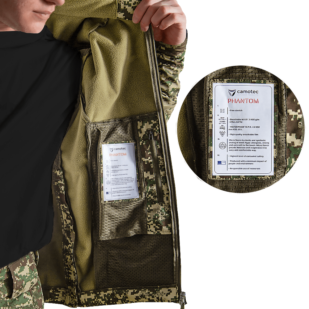 Куртка вироблена з оригінальної тканини SoftShell зі справжньою мембраною. Головною перевагою цього матеріалу є ідеальне утримання балансу між захистом від холоду, вологи й хорошою циркуляцією повітря.