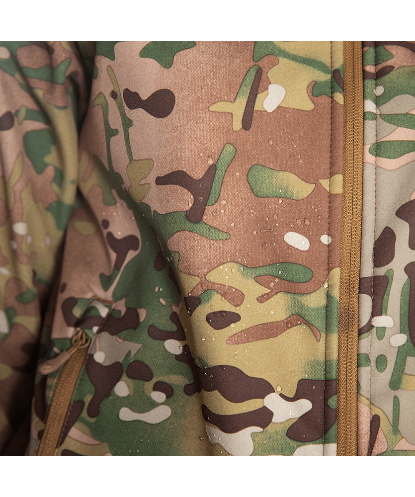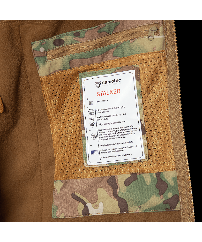 Куртка вироблена з оригінальної тканини SoftShell. Це легка, сучасна тканина зі справжньою безпоровою мембраною, яка складається з трьох шарів: мікрофліс який зберігає тепло; мембрана що захищає від вітру та вологи; еластичний поліестер із вологостійким просоченням, який захищає від пилу, бруду й вологи.