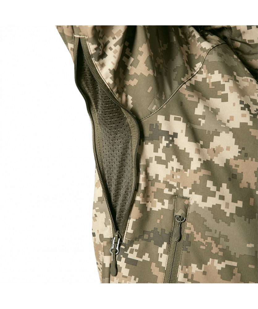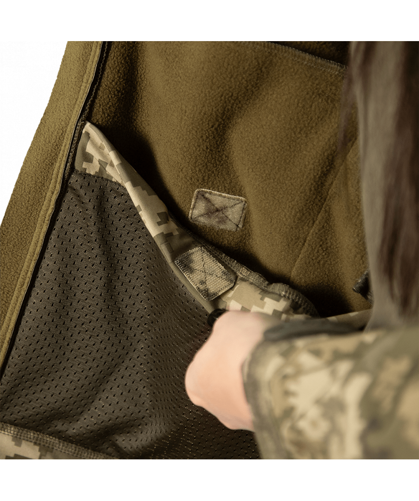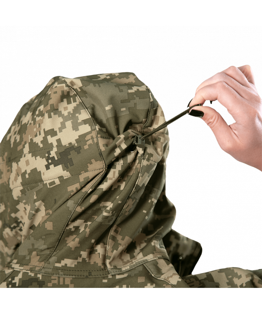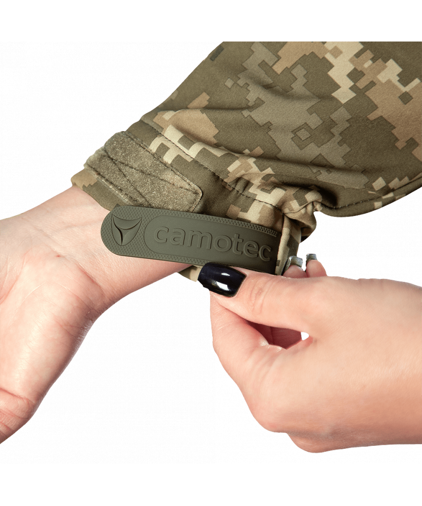 На рукавах присутні липучки під патчі або шеврони, манжети регулюються та фіксуються липучками.