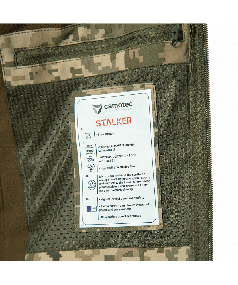 Куртка вироблена з оригінальної тканини SoftShell. Це легка, сучасна тканина зі справжньою безпоровою мембраною, яка складається з трьох шарів: мікрофліс який зберігає тепло; мембрана що захищає від вітру та вологи; еластичний поліестер із вологостійким просоченням, який захищає від пилу, бруду й вологи.