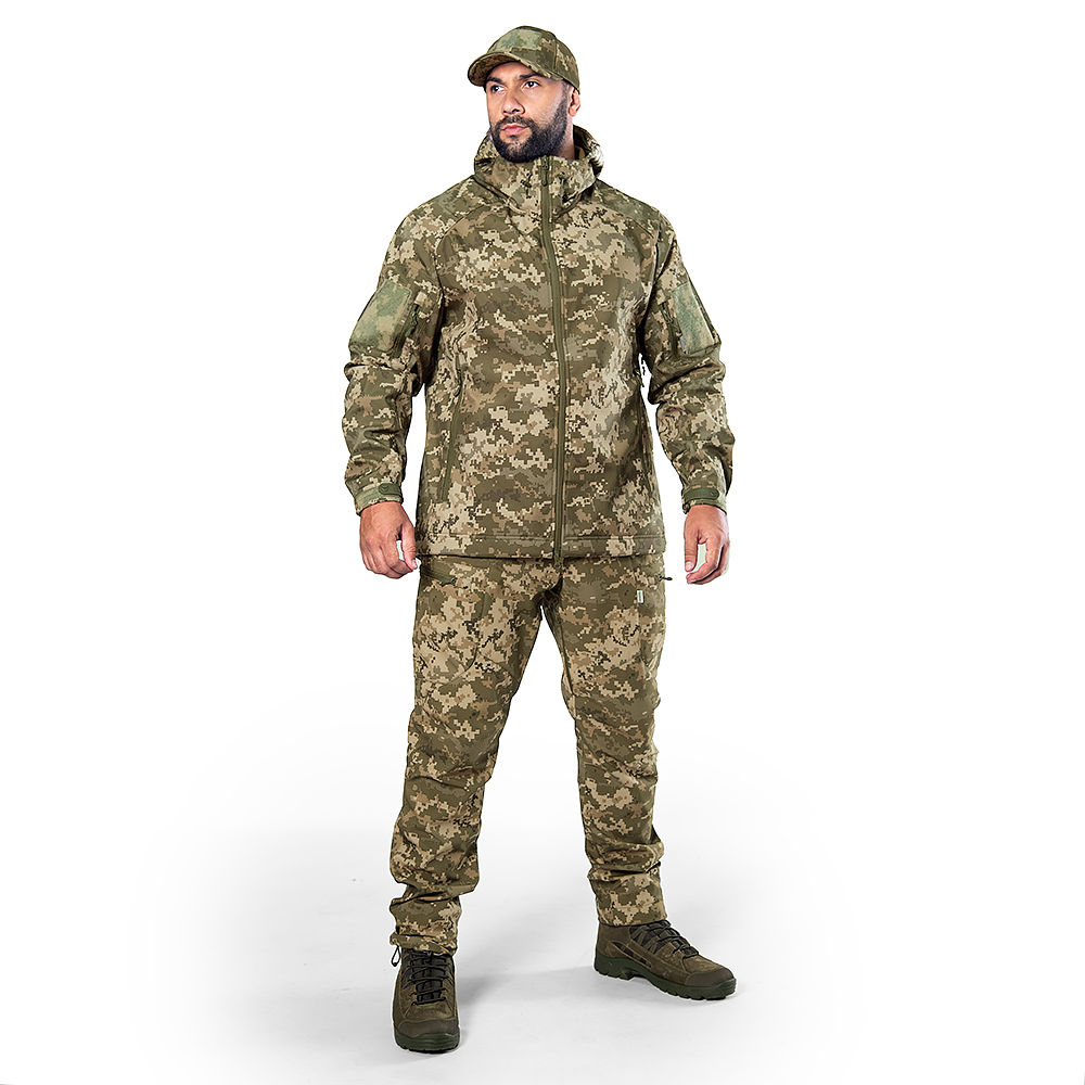 Штани вироблені з оригінальної тканини SoftShell. Це легка, сучасна тканина зі справжньою безпоровою мембраною, яка складається з трьох шарів: мікрофліс який зберігає тепло; мембрана що захищає від вітру та вологи; еластичний поліестер із вологостійким просоченням, який захищає від пилу, бруду й вологи.